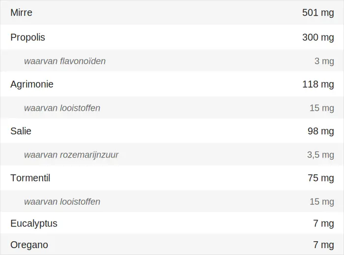 Glycerol (bevochtigingsmiddel); Water; Mirretinctuur (Commiphora molmol Engler, hars); Vloeibaar extract van propolis; Gamma-cyclodextrines; Gevriesdroogd extract van agrimonie (Agrimonia eupatoria L., bloeiende toppen); Gevriesdroogd extract van salie (Salvia officinalis L., blad); Gevriesdroogd extract van tormentil (Potentilla erecta L., rhizoom); Alfa-cyclodextrines; Essentiële olie van eucalyptus (Eucalyptus globulus Labill., blad) (aroma); Essentiële olie van oregano (Origanum vulgare L., bovengrondse delen) (aroma)