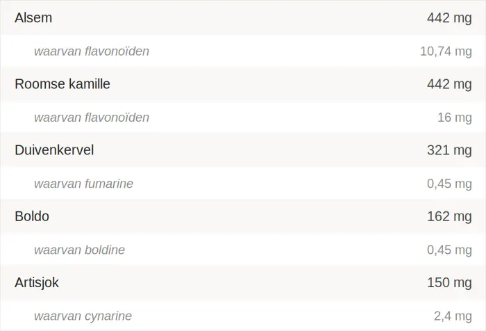 Water; Glycerol (bevochtigingsmiddel); Vloeibaar extract van alsem (Artemisia absinthium L., bloem); Vloeibaar extract van Roomse kamille (Anthemis nobilis L., bloem); Vloeibaar extract van duivenkervel (Fumaria officinalis L., bloeiende bovengrondse delen); Gamma-cyclodextrines; Alfa-cyclodextrines; Gevriesdroogd extract van boldo (Peumus boldus Molina, bladeren); Droog extract van artisjok (Cynara scolymus L., bladeren); Essentiële olie van rozemarijn (Rosmarinus officinalis L., bladeren) (aroma).