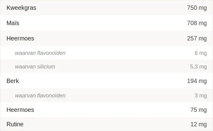Water; Vloeibaar extract van kweekgras (Agropyron repens (L.) P. Beauv., wortel); Vloeibaar extract van maïs (Zea mays L., stijlen); Glycerine (bevochtigingsmiddel); Gevriesdroogd extract van heermoes (Equisetum arvense L., bovengrondse delen); Gevriesdroogd extract van berk (Betula pendula Roth, blad); Gamma-cyclodextrines; Droog