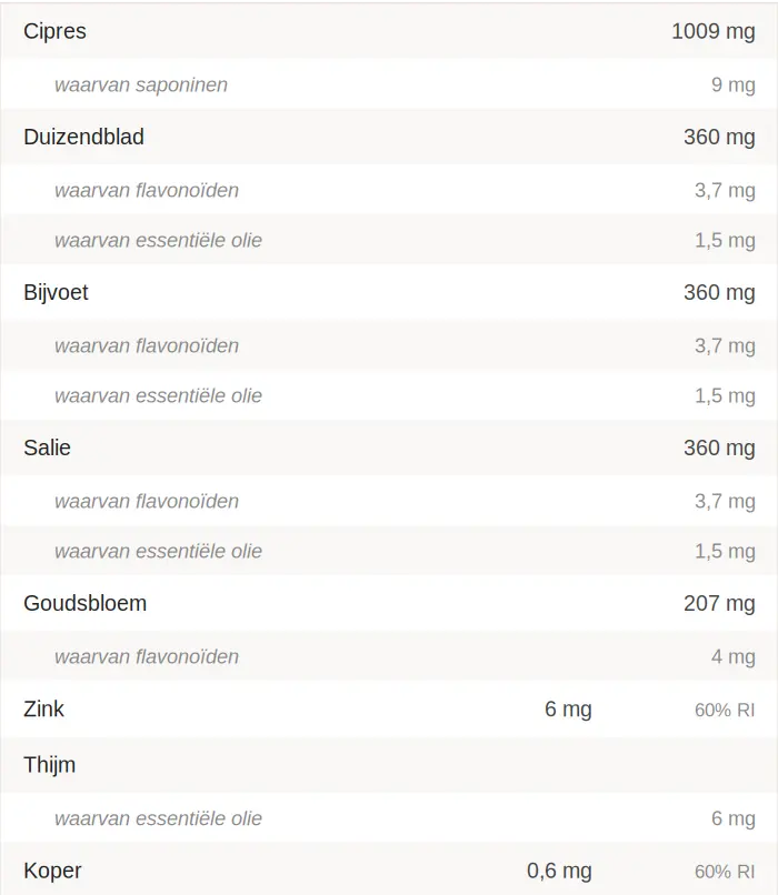 Vloeibaar extract van cipres (Cupressus sempervirens), vloeibaar extract van duizendblad (Achillea millefolium), vloeibaar extract van bijvoet (Artemisia vulgaris), vloeibaar extract van salie (Salvia officinalis), glycerine (bevochtigingsmiddel), gamma-cyclodextrines, gelyofiliseerd extract van goudsbloem (Calendula officinalis), alfa-cyclodextrines, zinkgluconaat (zink), essentiële olie van tijm (Thymus vulgaris) (aroma), kopergluconaat (koper).