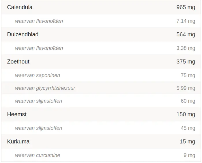 (bevochtigingsmiddel); vloeibaar extract van duizendblad (Achillea millefolium L., bovengronds deel); gelyofiliseerd extract van zoethout (Glycyrrhiza glabra L., wortel); gelyofiliseerd extract van heemst (Althaea officinalis L., wortel); gammacyclodextrines; alpha-cyclodextrines; gelyofiliseerd extract van kurkuma (Curcuma longa L., wortel).