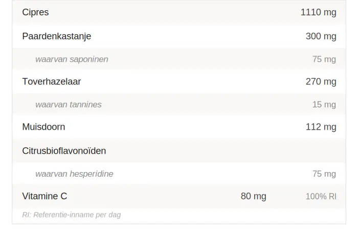 Vloeibaar extract van cipres (Cupressus sempervirens L., vrouwelijke kegels); water; glycerine (bevochtigingsmiddel); vloeibaar extract van paardenkastanje (Aesculus hippocastanum L., vrucht); vloeibaar extract van toverhazelaar (Hamamelis virginiana L., blad); citrusbioflavonoïden; gamma-cyclodextrines; gelyofiliseerd extract van muisdoorn (Ruscus aculeatus L., wortel); L-ascorbinezuur (vitamine C); alfa-cyclodextrines