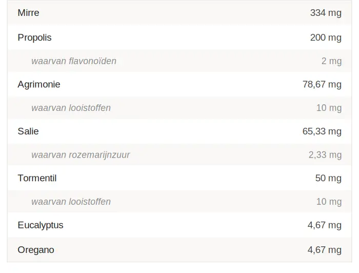 Glycerol (bevochtigingsmiddel); Water; Mirretinctuur (Commiphora molmol Engler, hars); Vloeibaar extract van propolis; Gamma-cyclodextrines; Gevriesdroogd extract van agrimonie (Agrimonia eupatoria L., bloeiende toppen); Gevriesdroogd extract van salie (Salvia officinalis L., blad); Gevriesdroogd extract van tormentil (Potentilla erecta L., rhizoom); Alfa-cyclodextrines; Essentiële olie van eucalyptus (Eucalyptus globulus Labill., blad) (aroma); Essentiële olie van oregano (Origanum vulgare L., bovengrondse delen) (aroma).